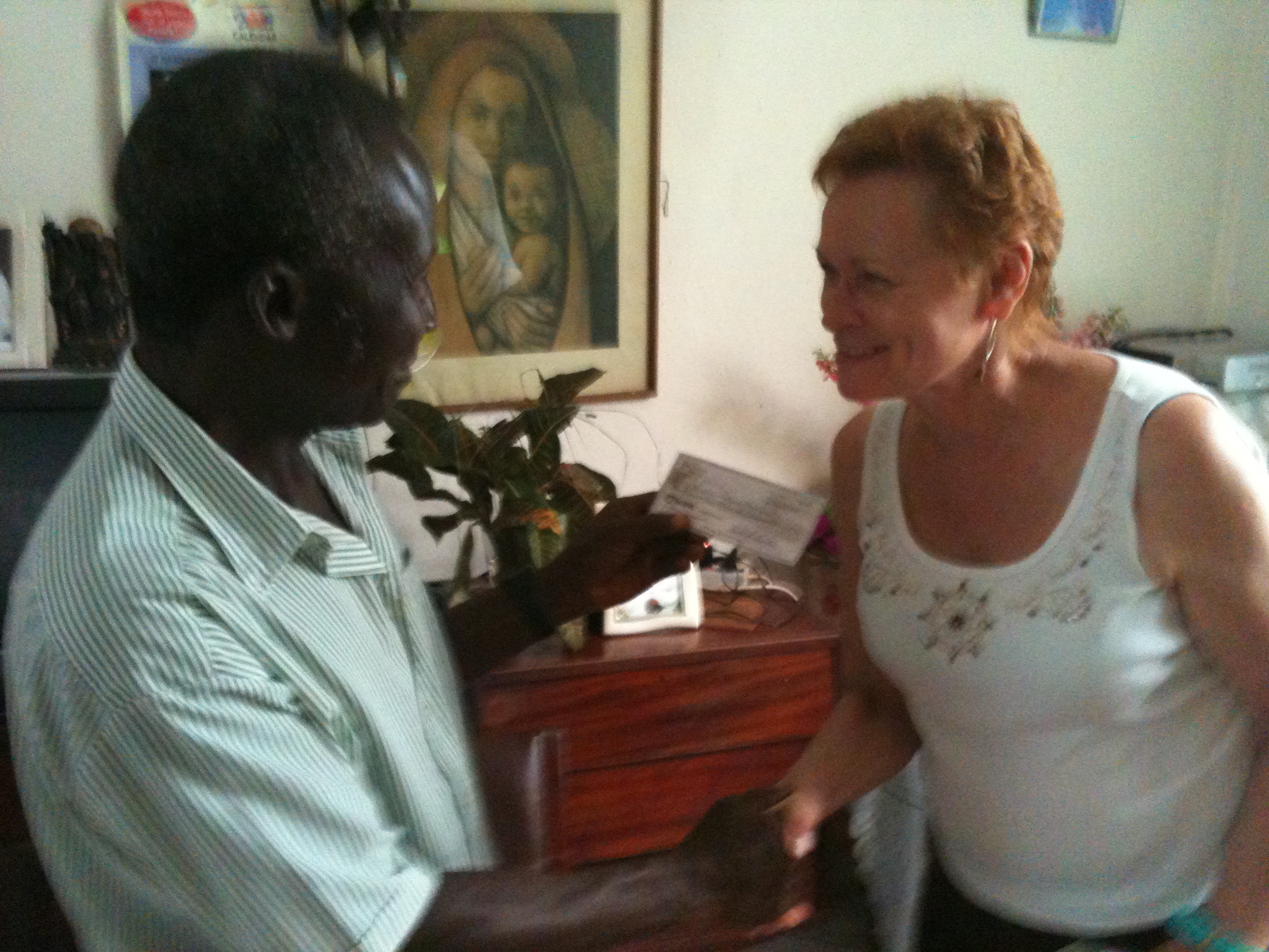 2011 – Faith Lester, hand-delivering a check for $1,500 to Bishop Patrick Koroma of the Kenema Diocese.